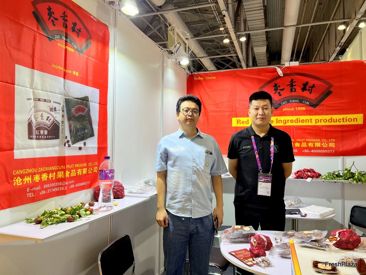 Mr Boyuan Li (right) with his colleague from Changzhou ZaoXiangCun. Date is the company's main product. Besides fresh date, the company also has a wide variety of processed date products. / Boyuan Li 先生(右)与沧州枣香村果食品有限公司的同事。枣是公司的主要产品。除鲜枣外,公司还拥有多种枣加工产品。