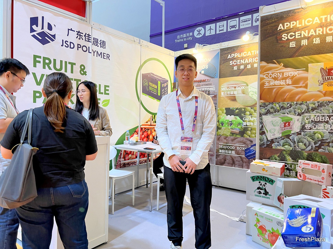 Representative of JSD Polymer, a packaging manufacturer from Guangdong province with their packacking products at the stand. / 来自广东省的包装制造商广东佳晟德的代表在展台上展示了他们的包装产品。
