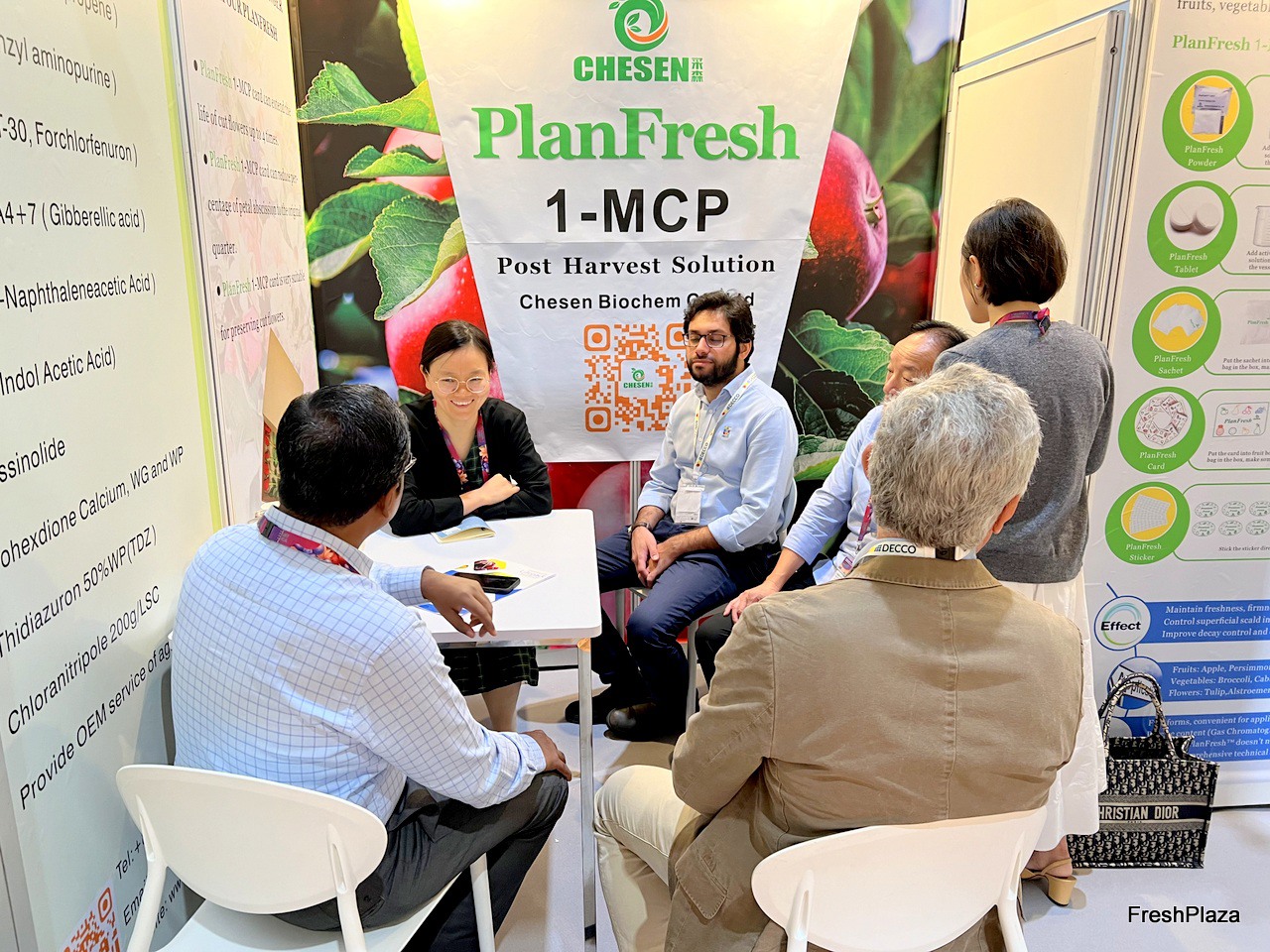 Cathy (second left) at Chesen Biochem is talking with her clients at the stand. 1-MCP is the company's main product. / 合肥采森生物科技有限公司的 Cathy(左二)正在展位上与她的客户交谈。 1-MCP是公司的主要产品。