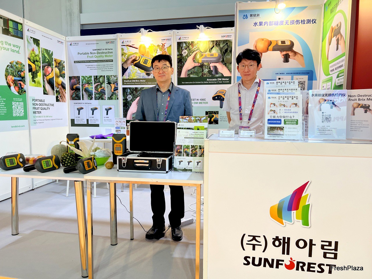 Mr Jay Hwang (left) with his colleague from Sun Forest, a South Korean manufacturer of portable non-destructive testing equipment for fresh produce. / Jay Hwang 先生(左)和他来自 Sun Forest 的同事,Sun Forest 是一家韩国便携式新鲜农产品无损检测设备制造商。