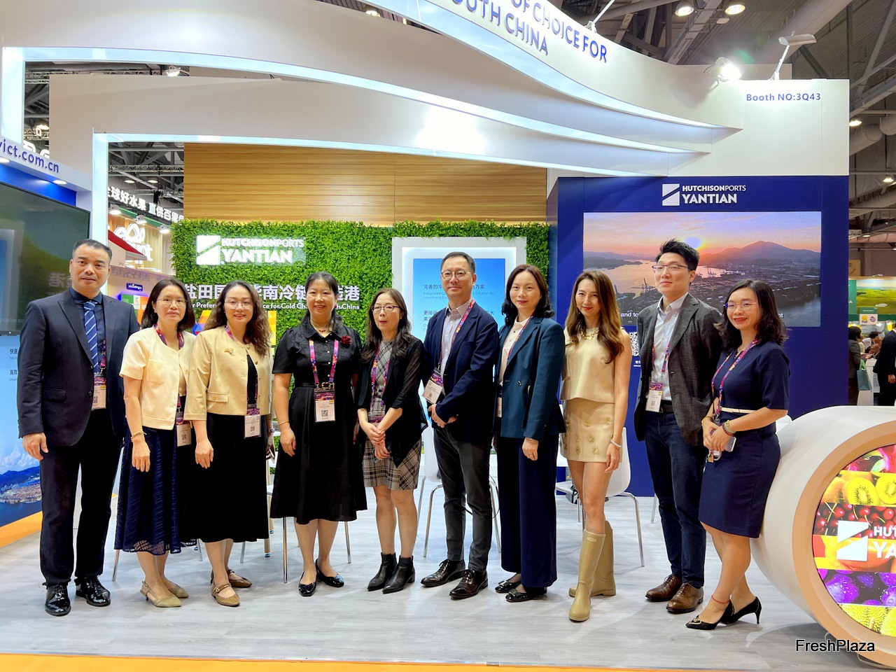 The team of Hutchison Ports Yanatian with their visitors at the stand. / 盐田冷链团队与访客在展台前合影。