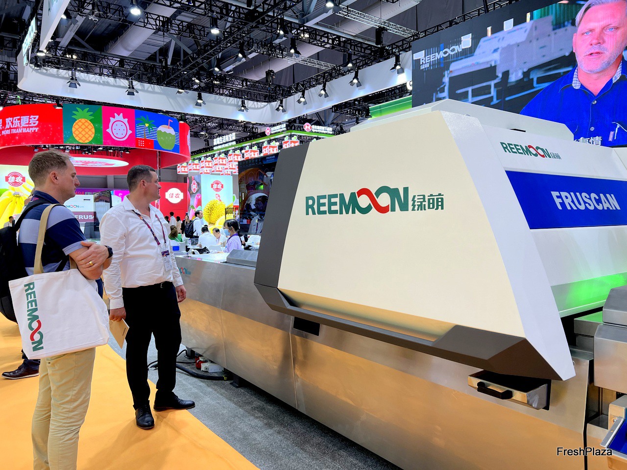The Reemoon sales representative is demonstrating the Fruscan sorting system to a visitor. / 绿萌科技销售代表正在向参观者演示Fruscan分拣系统。