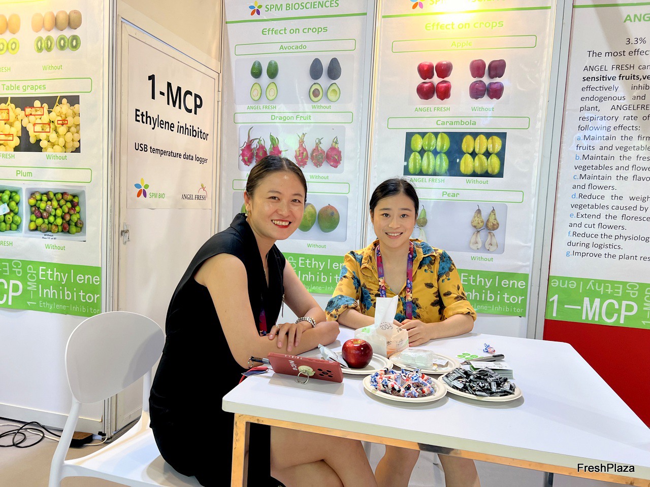 Ms Li (left) from SPM BIO, a 1-MCP producer and Tina (right) from Freshkey, a datalogger seller. / 1-MCP 生产商 SPM BIO 的李女士(左)和数据记录器销售商 Freshkey 的 Tina Sun(右)。