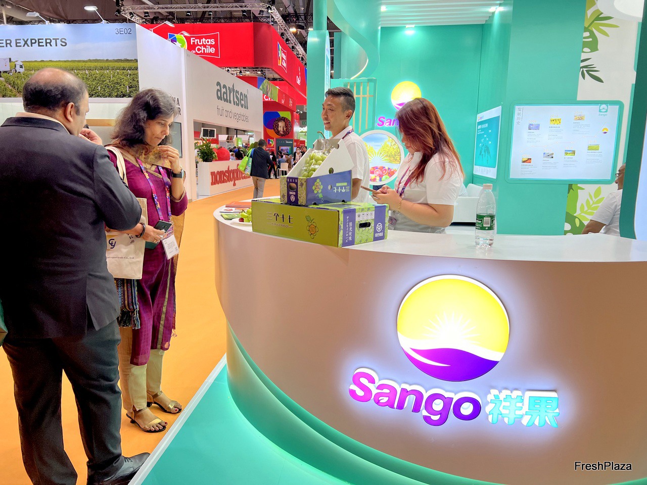 Visitors are tasting grapes at the Sango stand. / 参观者在祥果展位品尝葡萄。