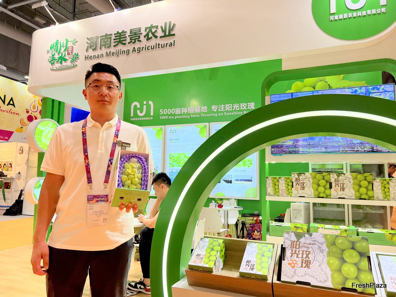 Mr Zi Qiang Zhang from Henan Meijing Agricultural. Shine Muscat is the the company's only product. The company has 5000 mu planting base in Henan province. / 河南美景农业的 Zi Qiang Zhang 先生。 阳光玫瑰是该公司的唯一产品。公司在河南省拥有5000亩种植基地。