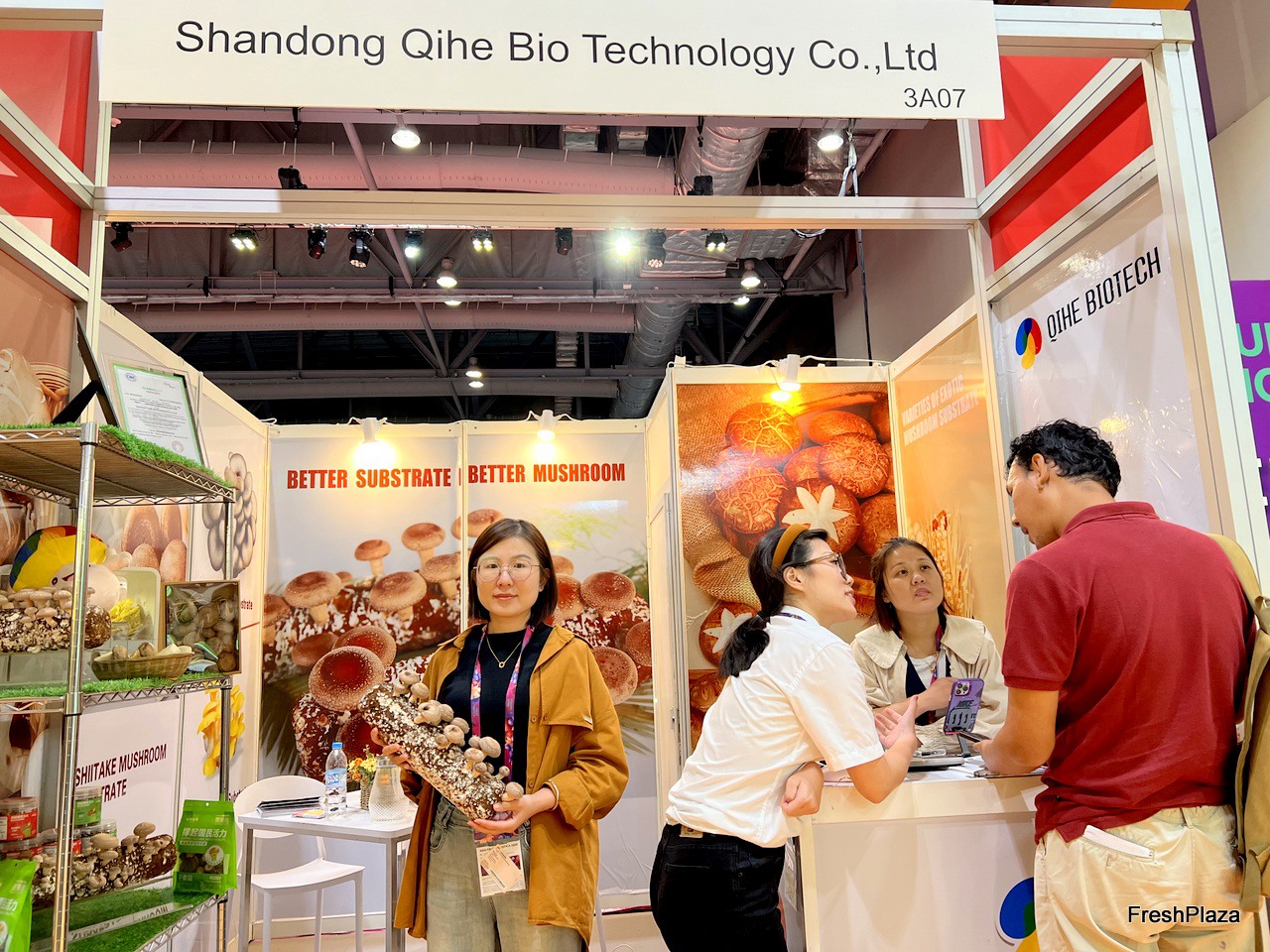 Amber from Qihe Biotech. The company exports a variety of substrate to around the world. / 齐禾生物的展位。该公司向世界各地出口各种基材。