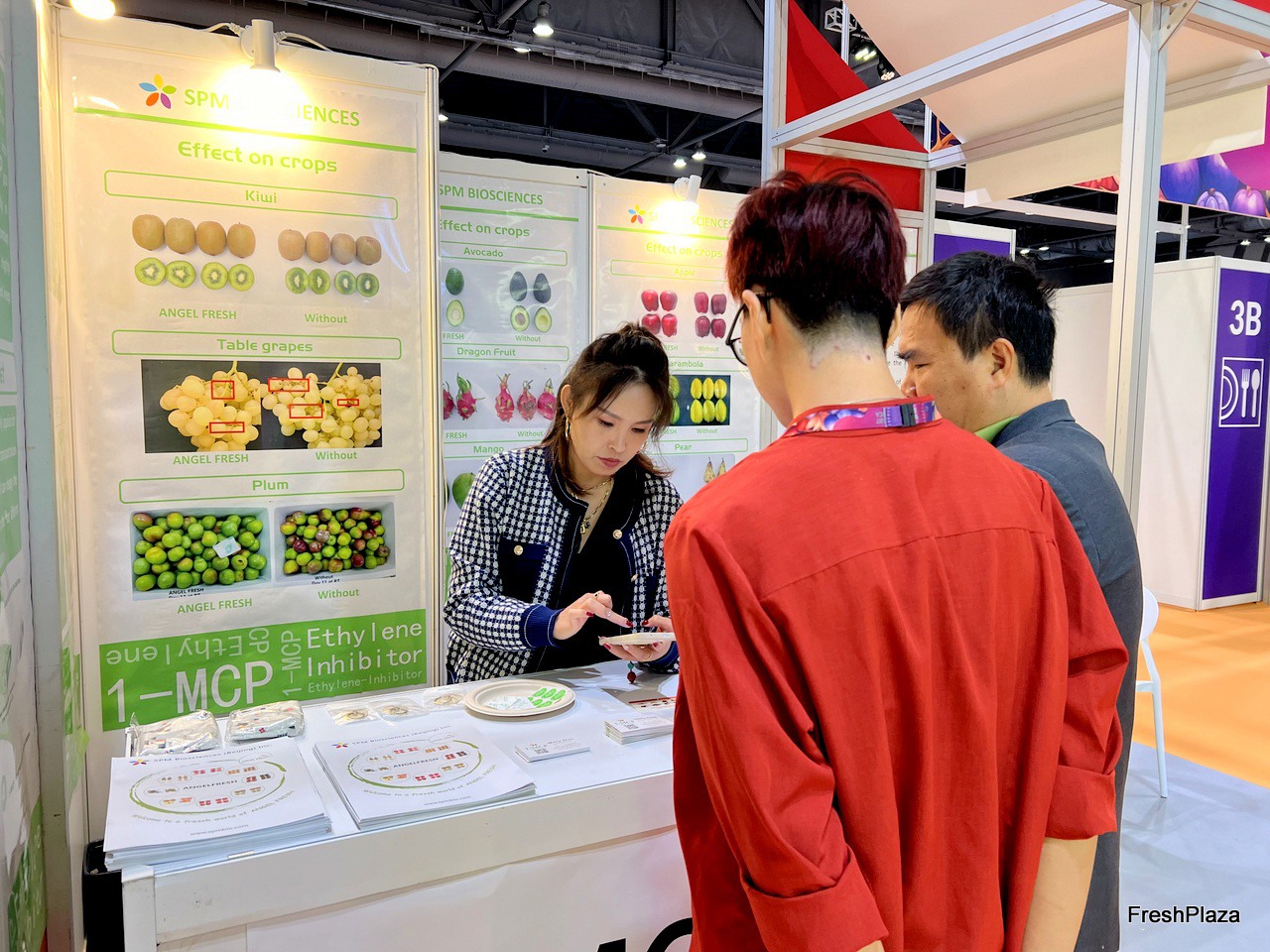 Debby from SPM BIO (left) is talking with visitors. The company manufactures 1-MCP. Their products are exported to many regions. / SPM BIO 的 Debby(左)正在与参观者交谈。该公司生产1-MCP。他们的产品出口到许多地区。
