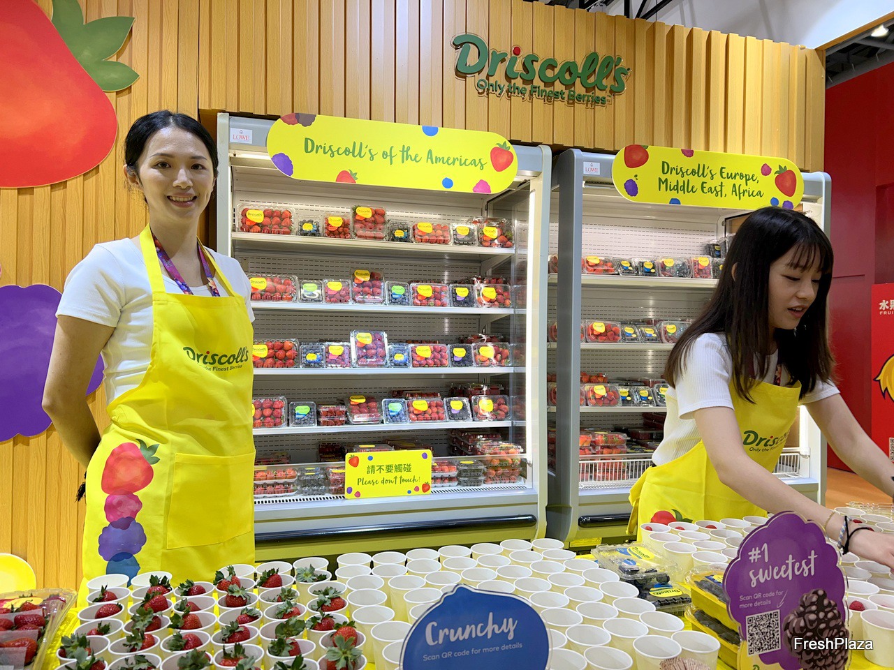 At Driscoll's stand, the team is providing tasting samples to visitors. / 在 Driscoll 的展位上,公司团队正在向参观者提供品尝样品。