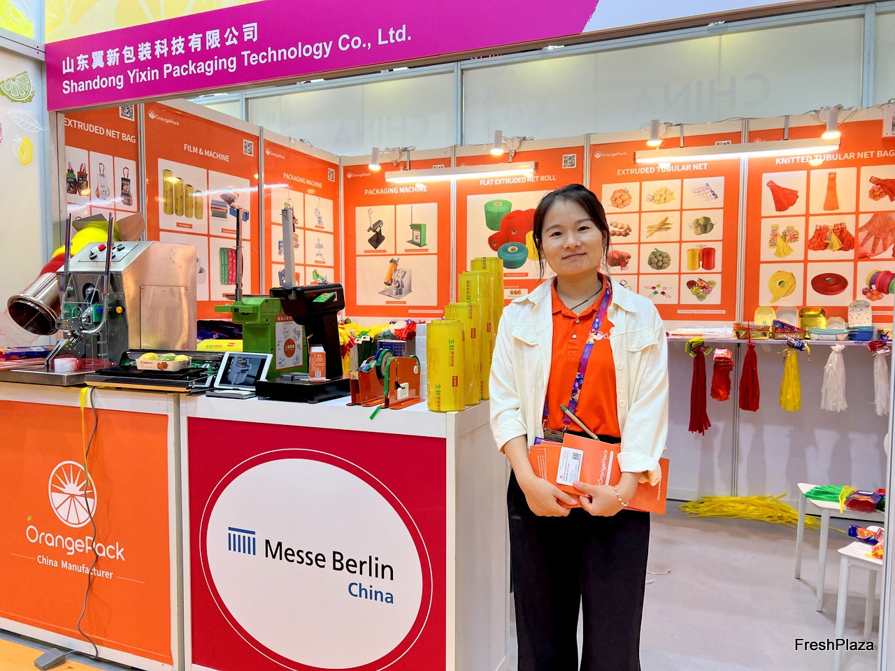 Sales representative from Yongfeng Packaging. The company produces a wide range of net bags, from 2kg for fruit to 25kg for onions. / 永丰包装销售代表。该公司生产各种规格的网袋,适用于从 2 公斤水果到 25 公斤重量不等的洋葱。