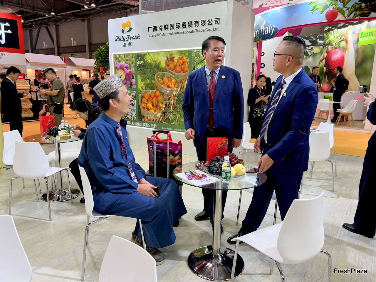 Mr Liao of HolyFresh (right) talking to his customers from Malaysia (left). HolyFresh grows and exports a wide variety of fruits. Mandarins and grapes are one of their main products. / HolyFresh 的廖先生(右)与来自马来西亚的顾客(左)交谈。 广东冷鲜国际贸易有限公司种植并出口多种水果。橘子和葡萄是他们的主要产品之一。