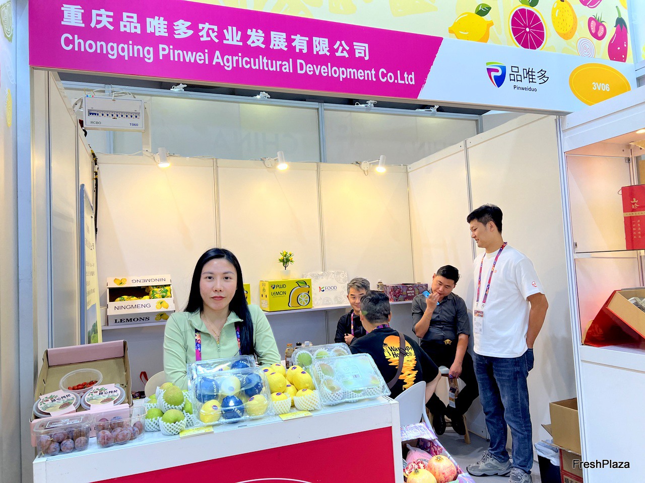 Representatives at Chongqing Yumaotong Technology are talking with a visitor. Lemons and Onions are the company's main export products. / Chongqing Yumaotong Technology 代表正在与到访者交谈。柠檬和洋葱是该公司的主要出口产品。